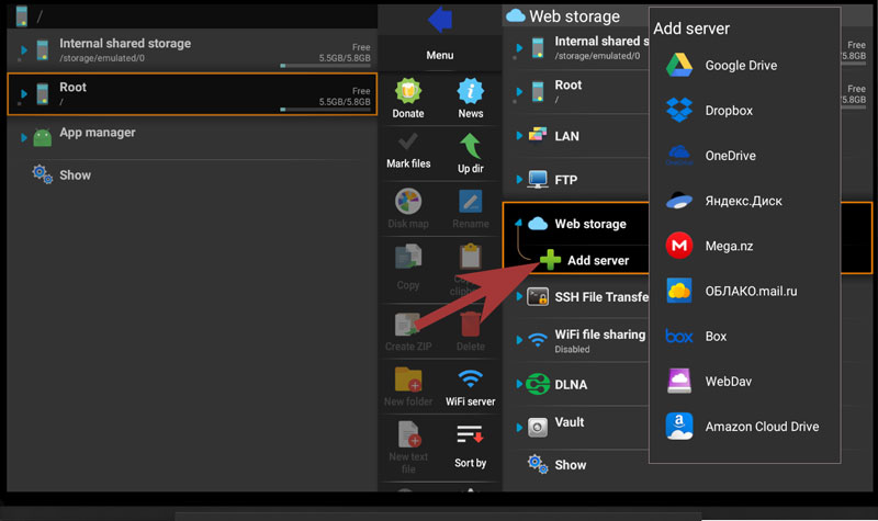 X-plore 앱의 오른편에서 Web Storage(웹 저장 공간)의 Add Sever(서버 추가)를 눌러, 파일을 저장했던 클라우드(Google Drive, Drop Box, One Drive)를 추가합니다.